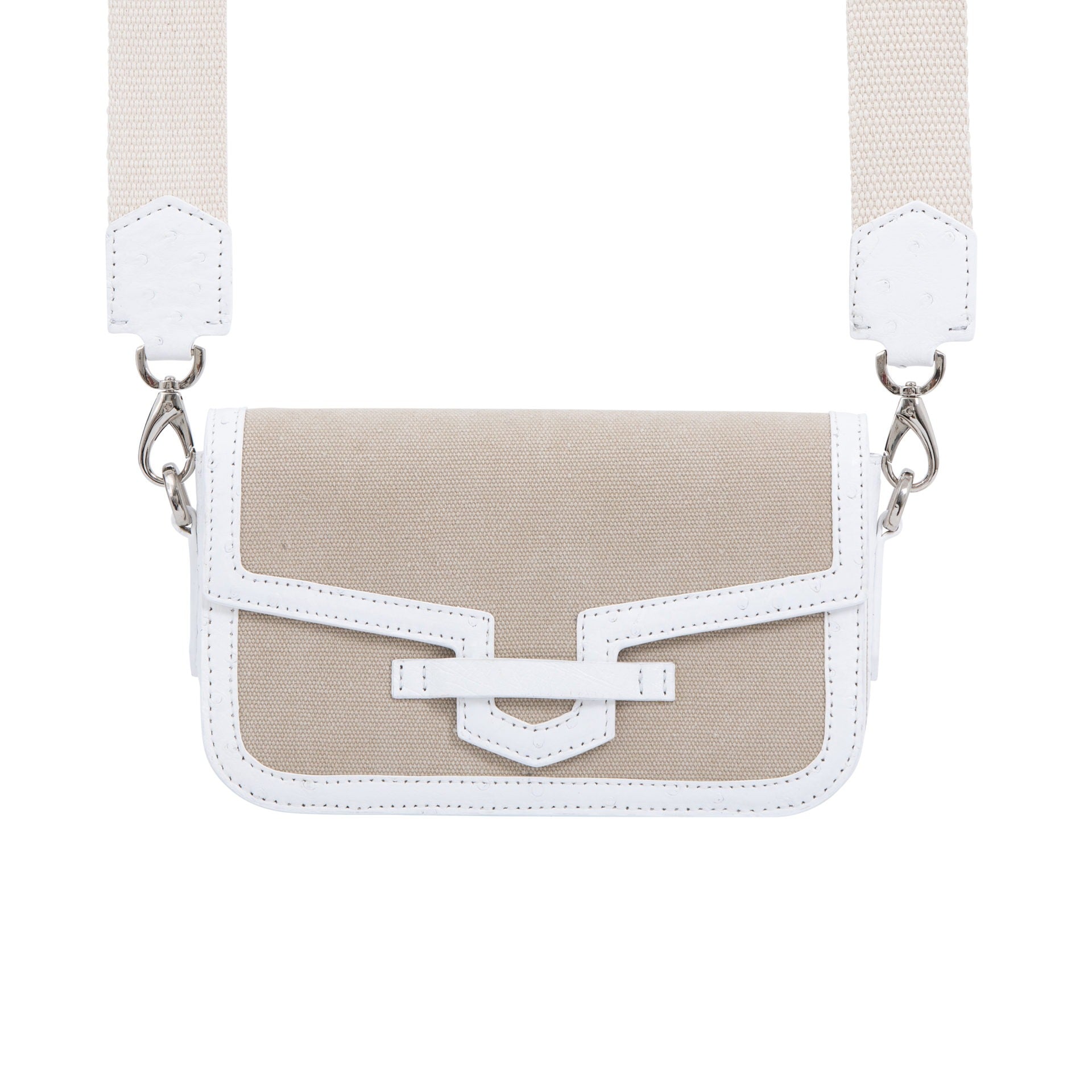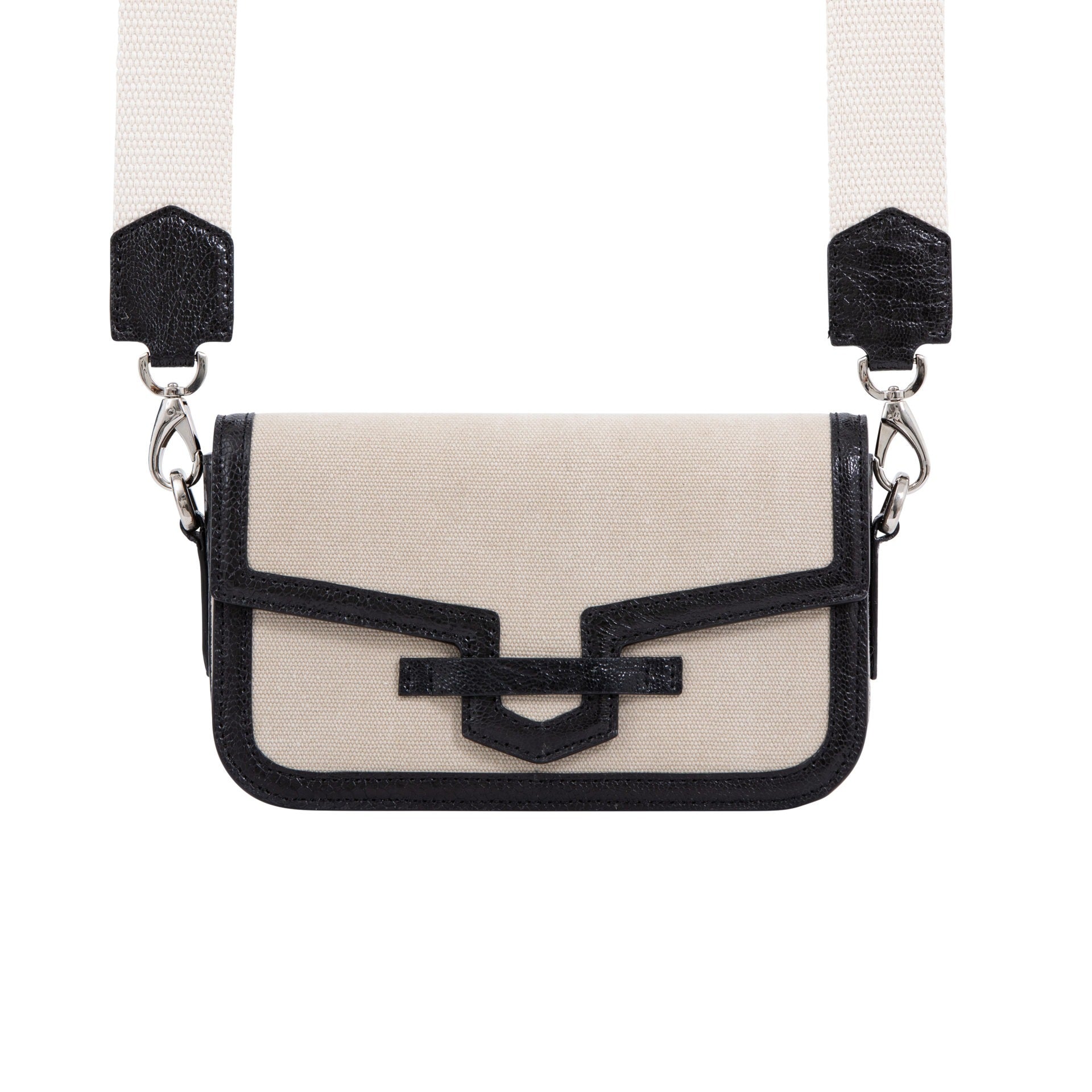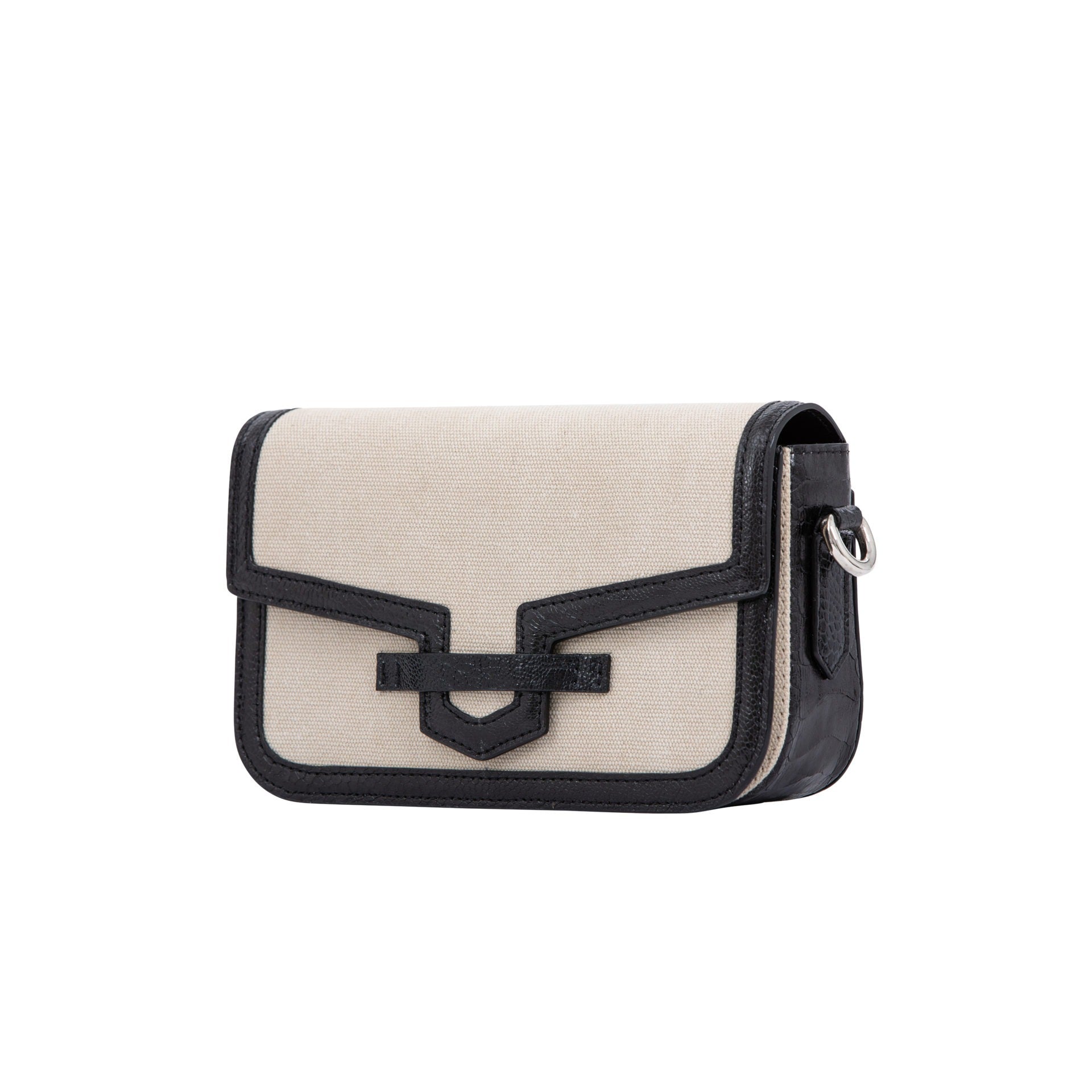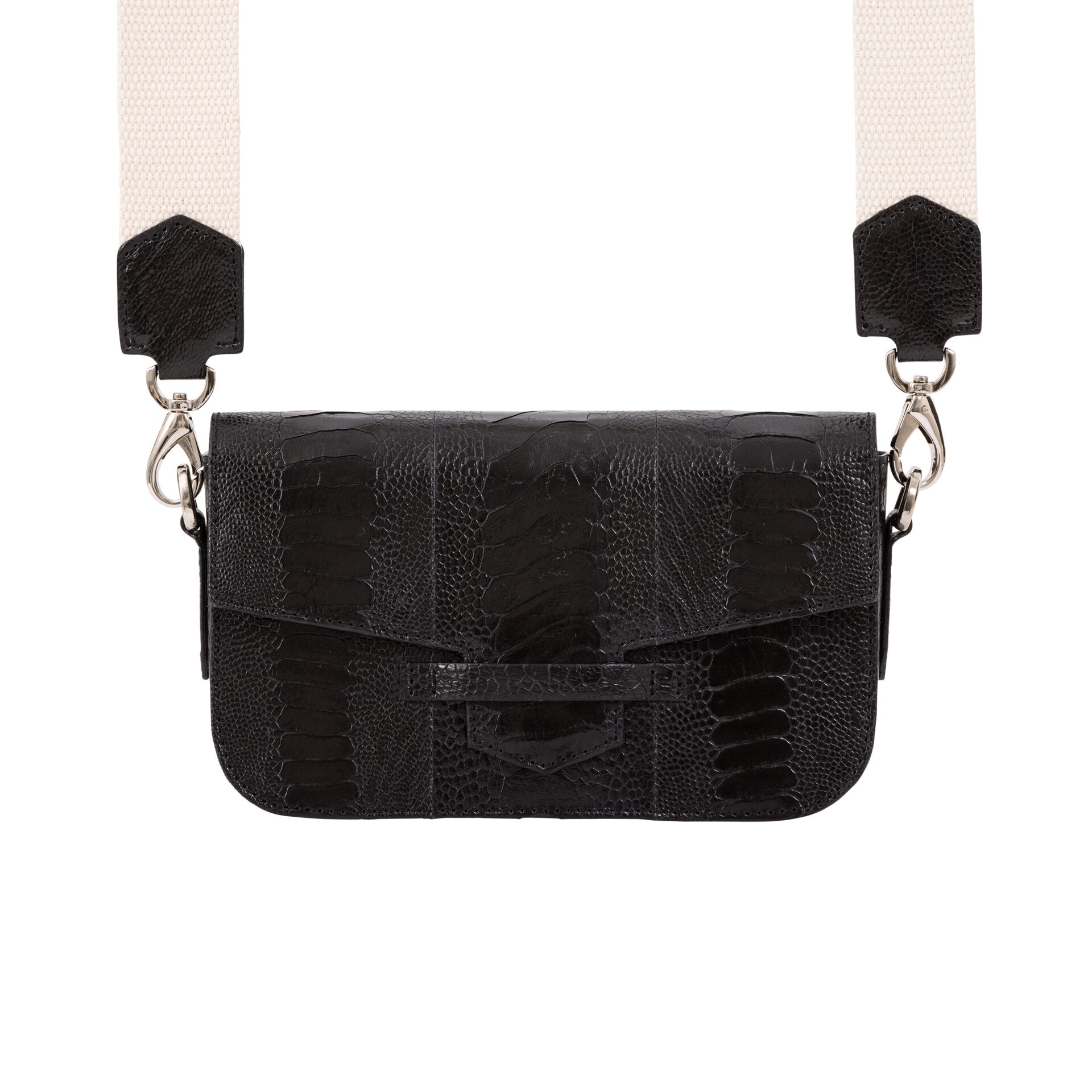 Caia Crossbody in Black Ostrich Leg & Beige Canvas