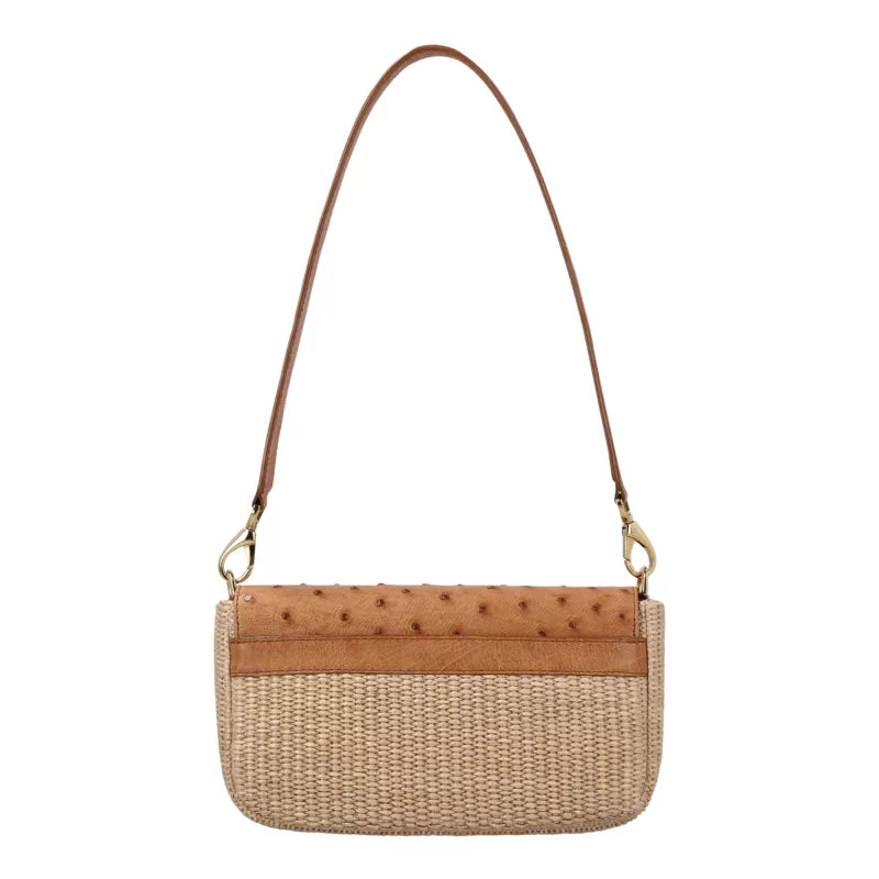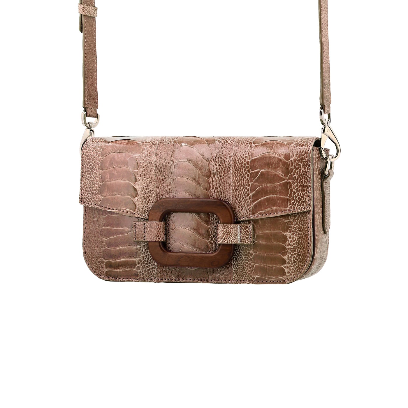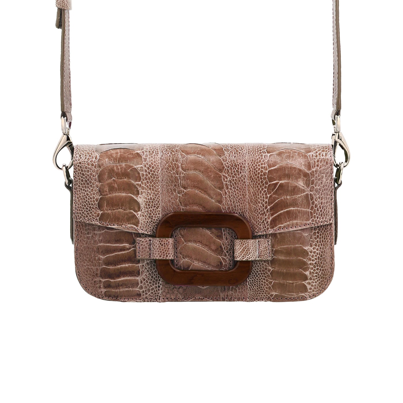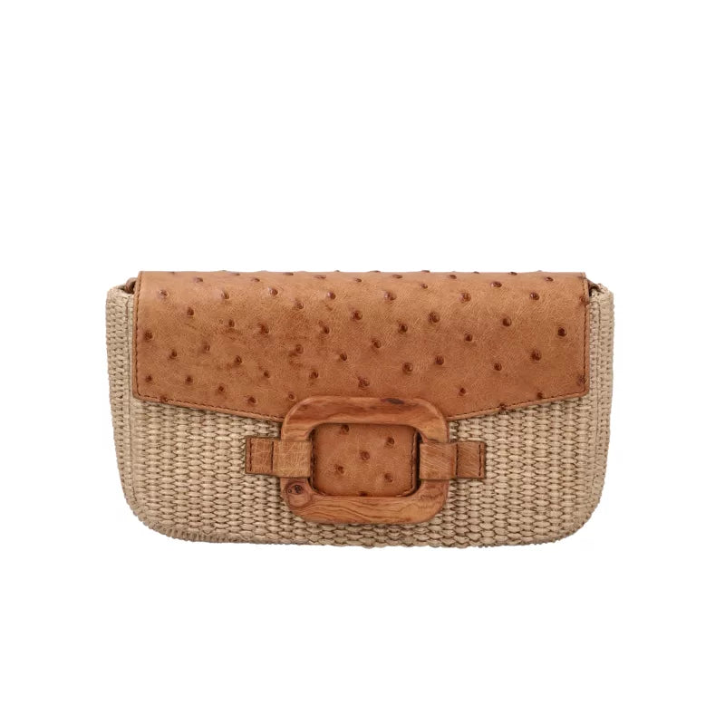 Deya Crossbody in Luggage Ostrich with a wood Ring Detail