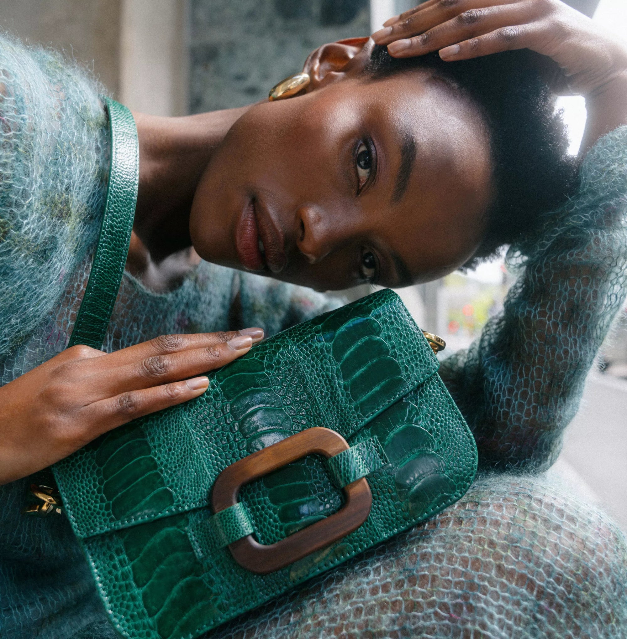 Deya in Natural Raffia & Forest Green Ostrich Leg