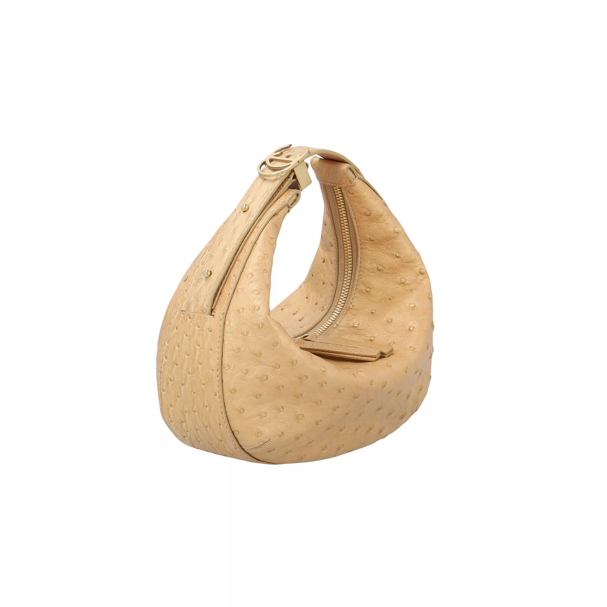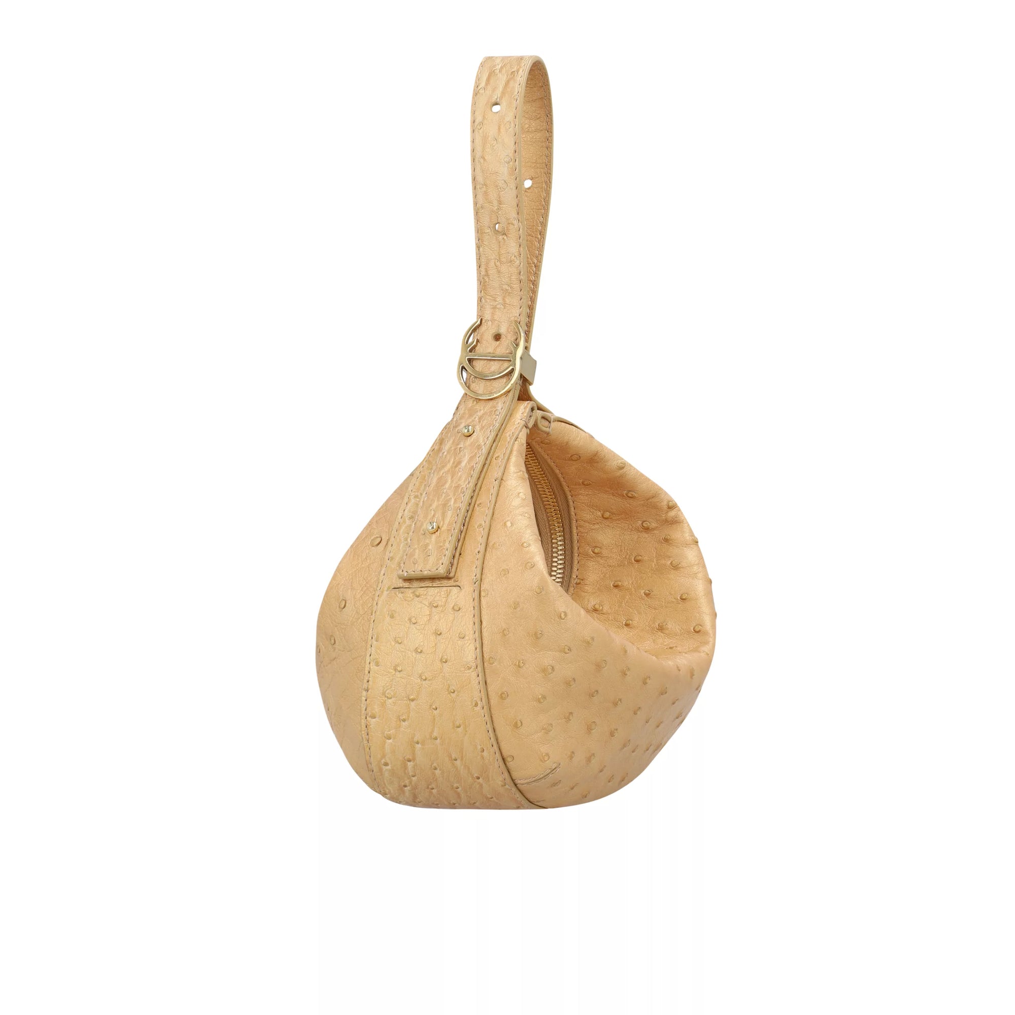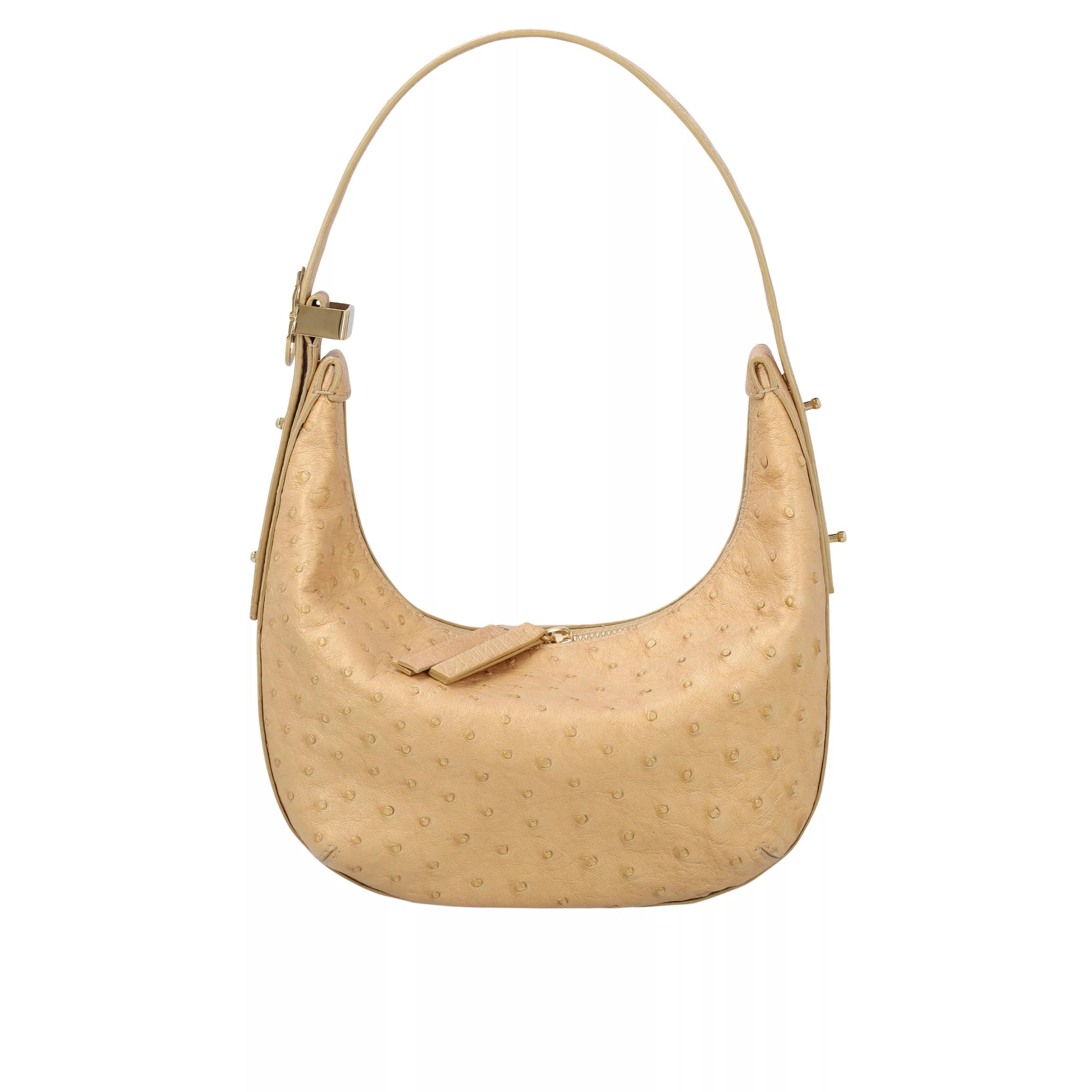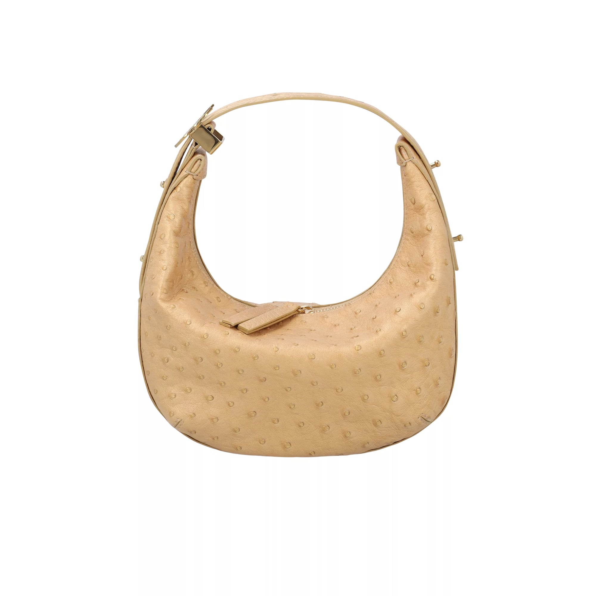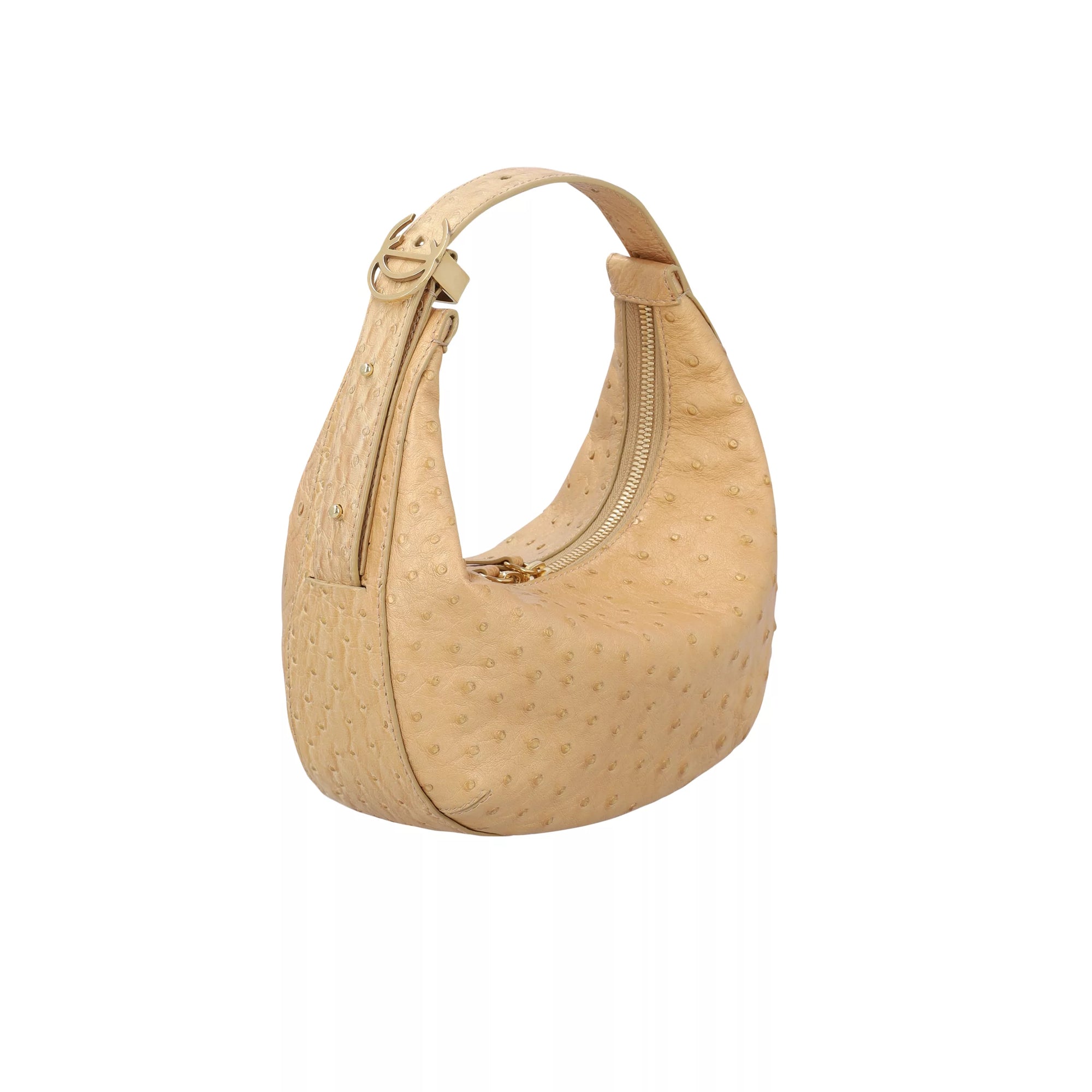 Maroon ostrich-textured handbag with gold zipper on a white background