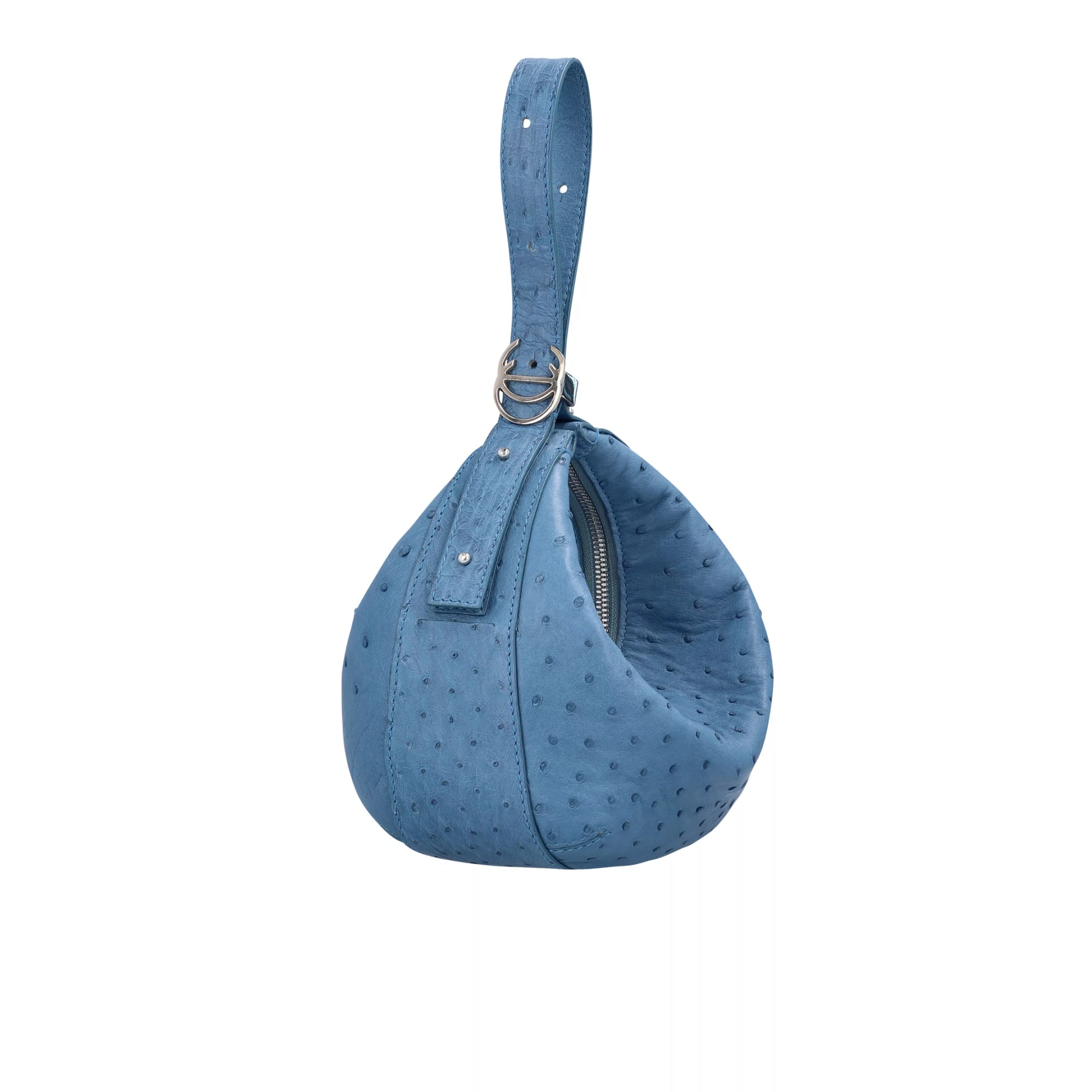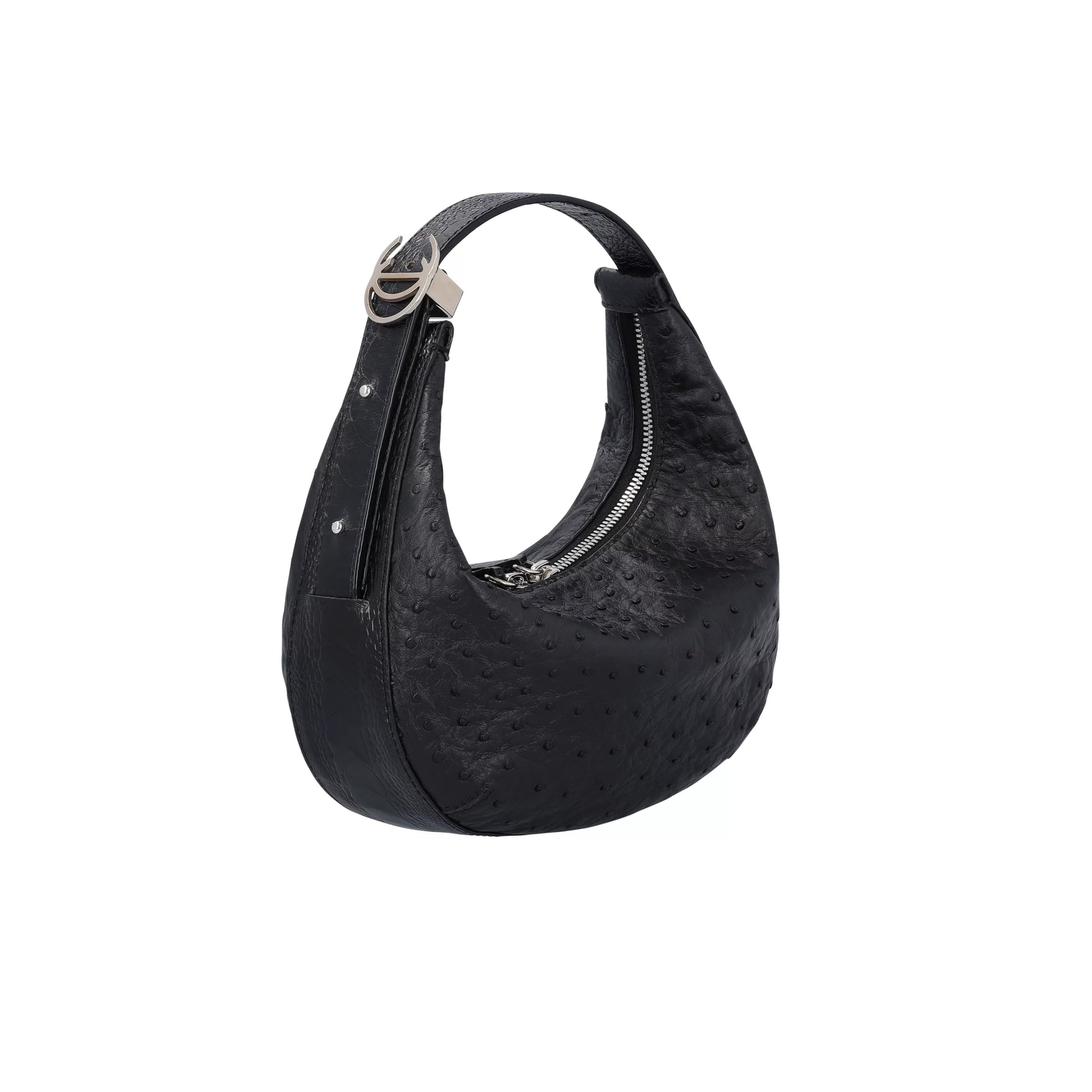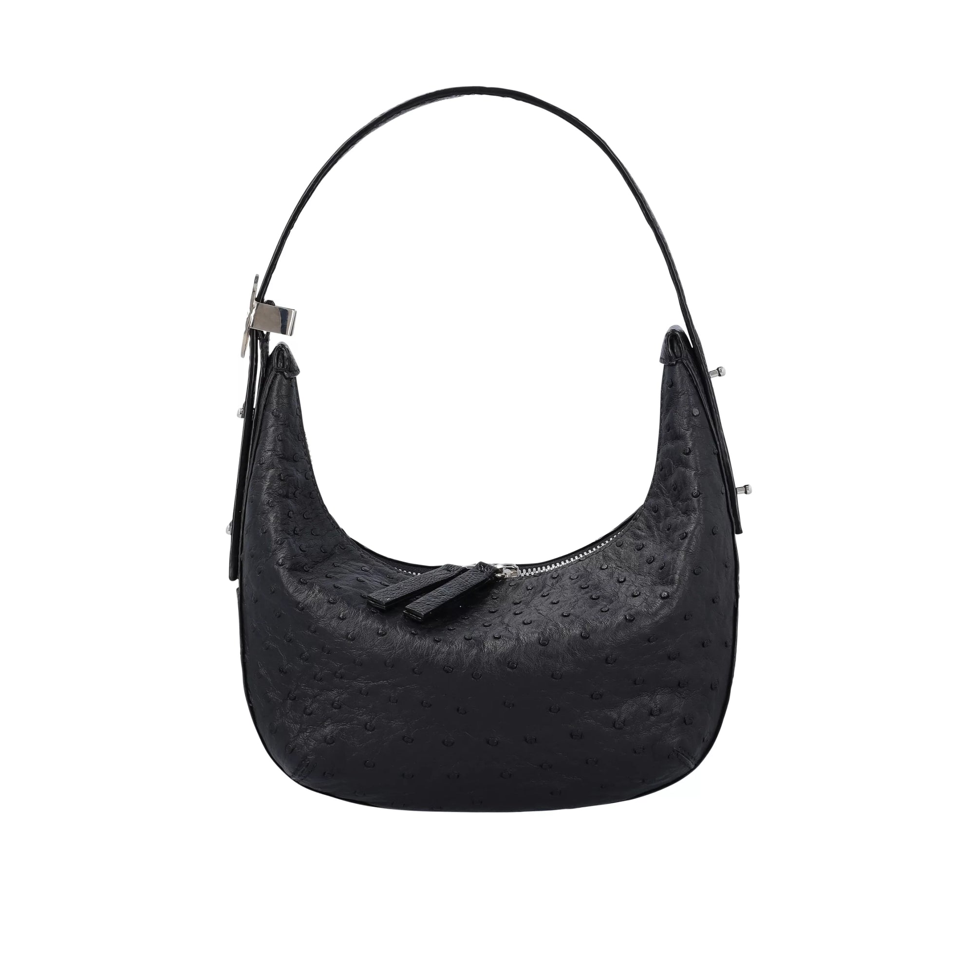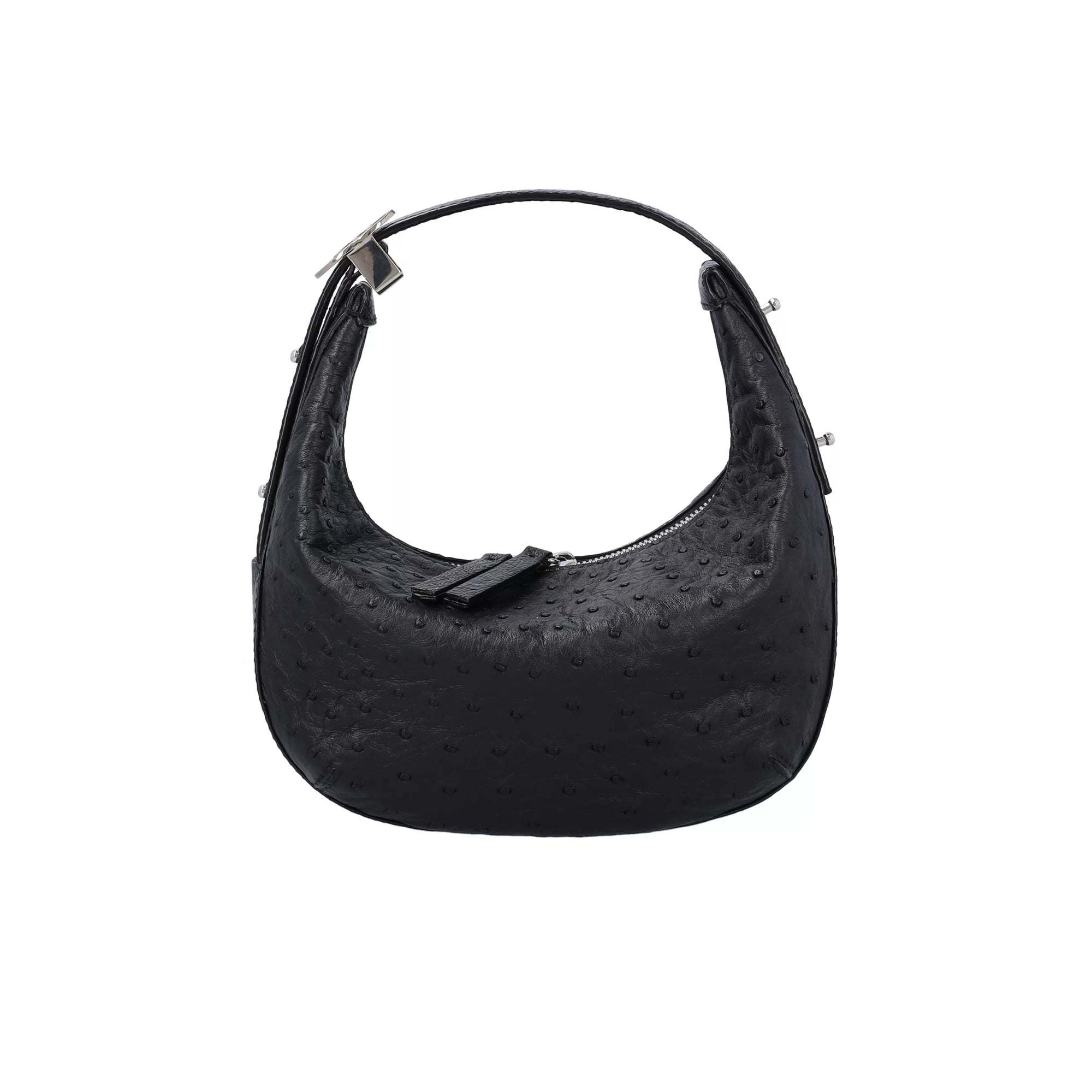 Maroon ostrich-textured handbag with gold zipper on a white background