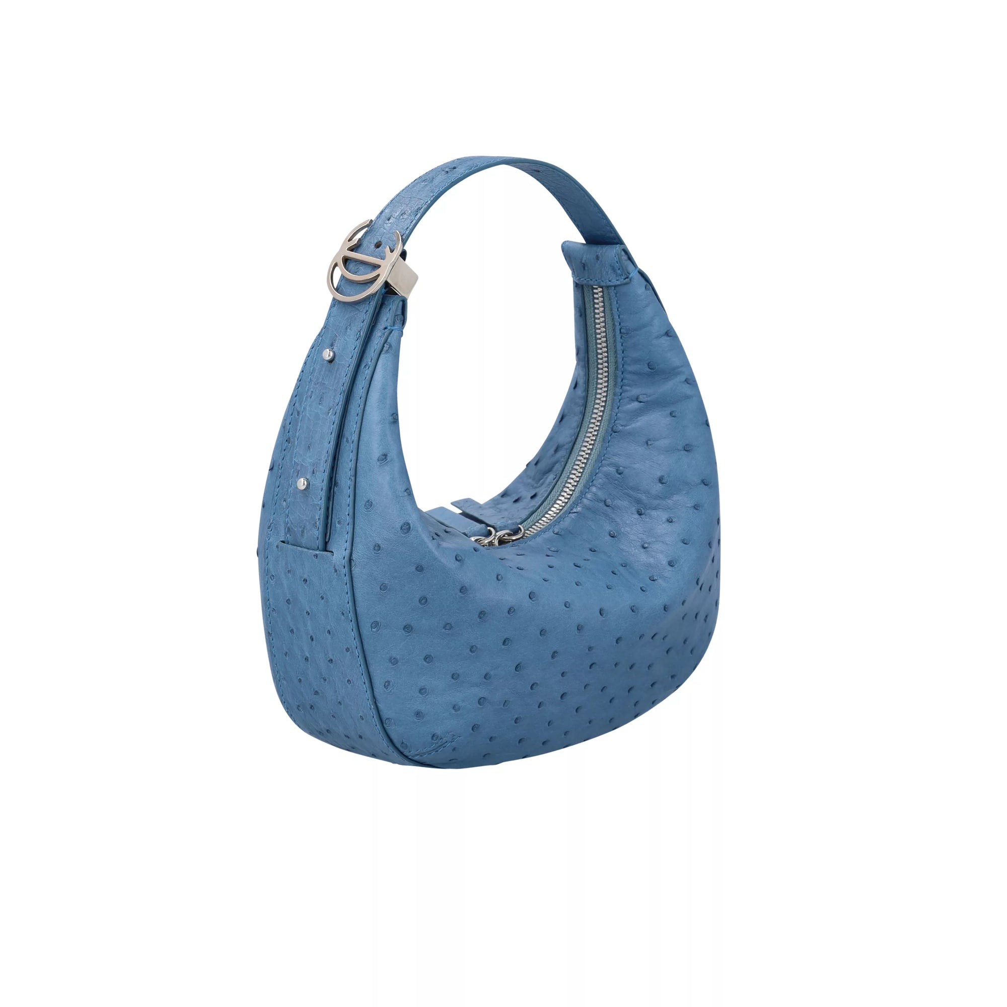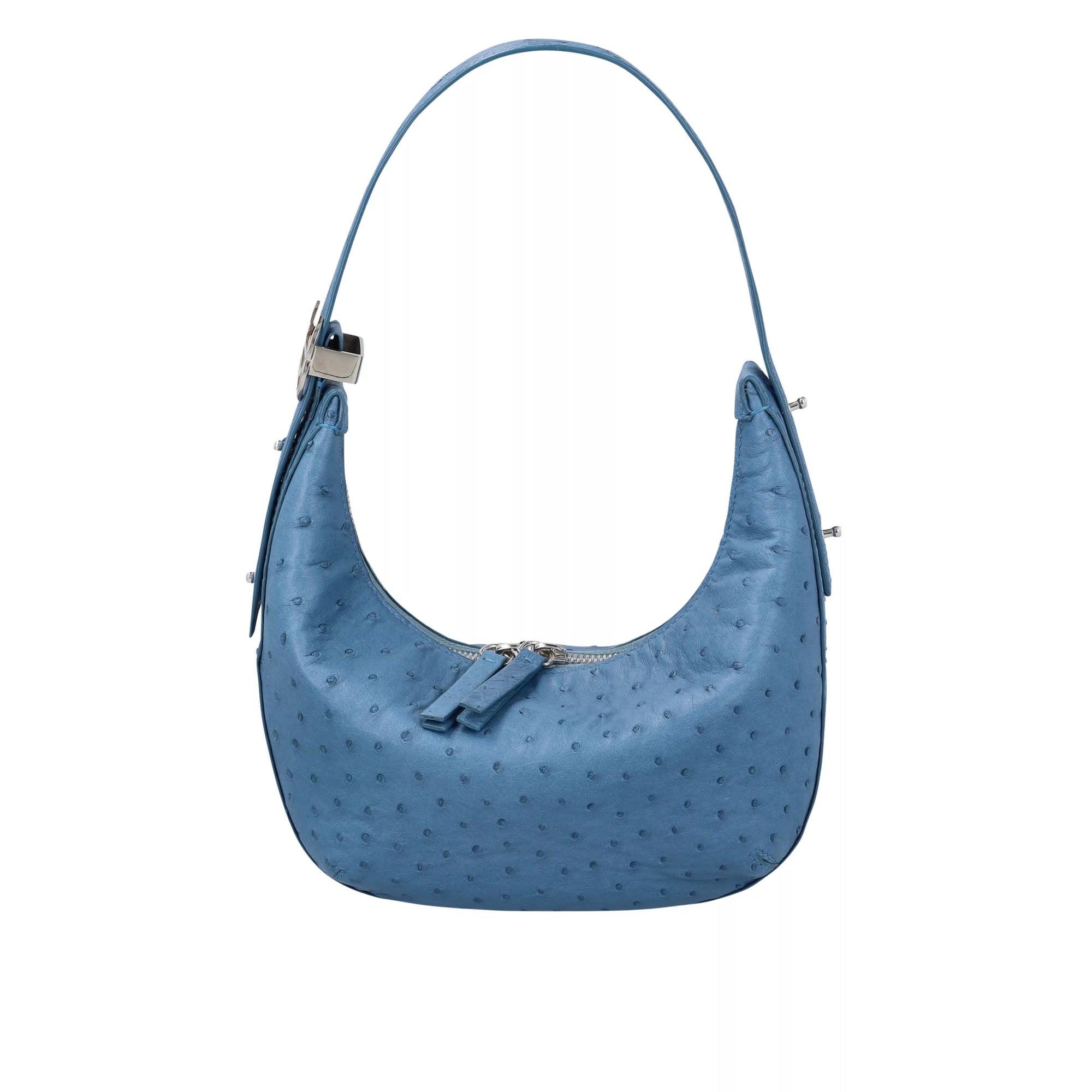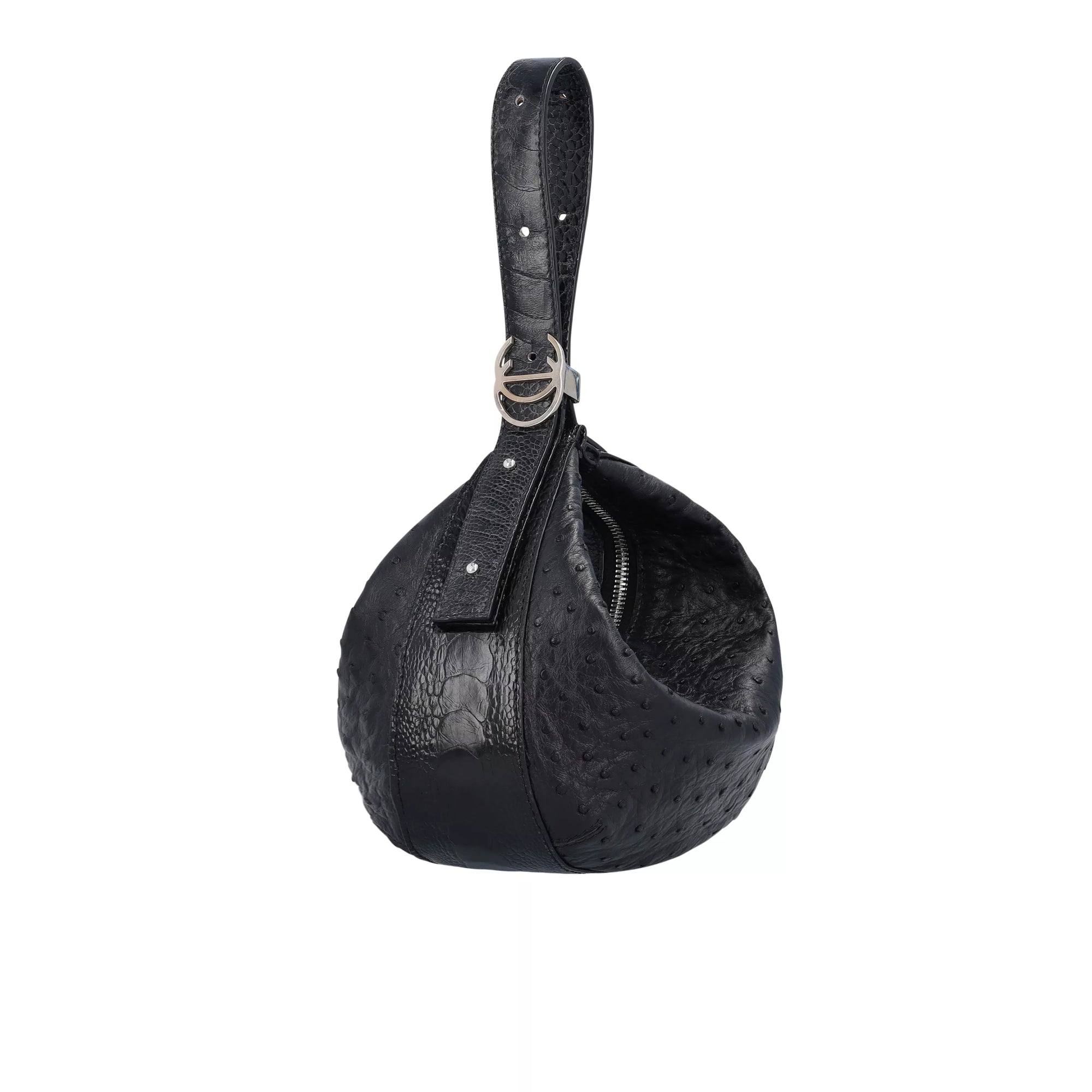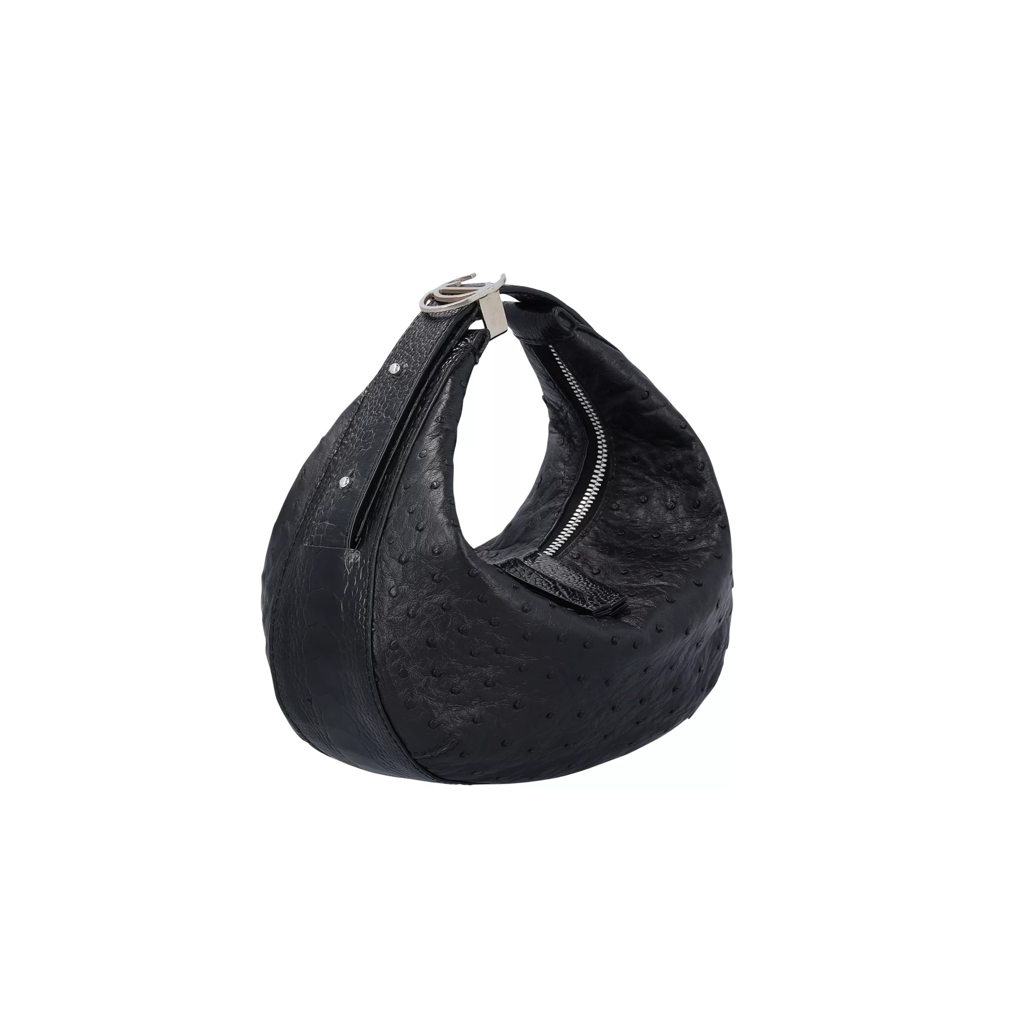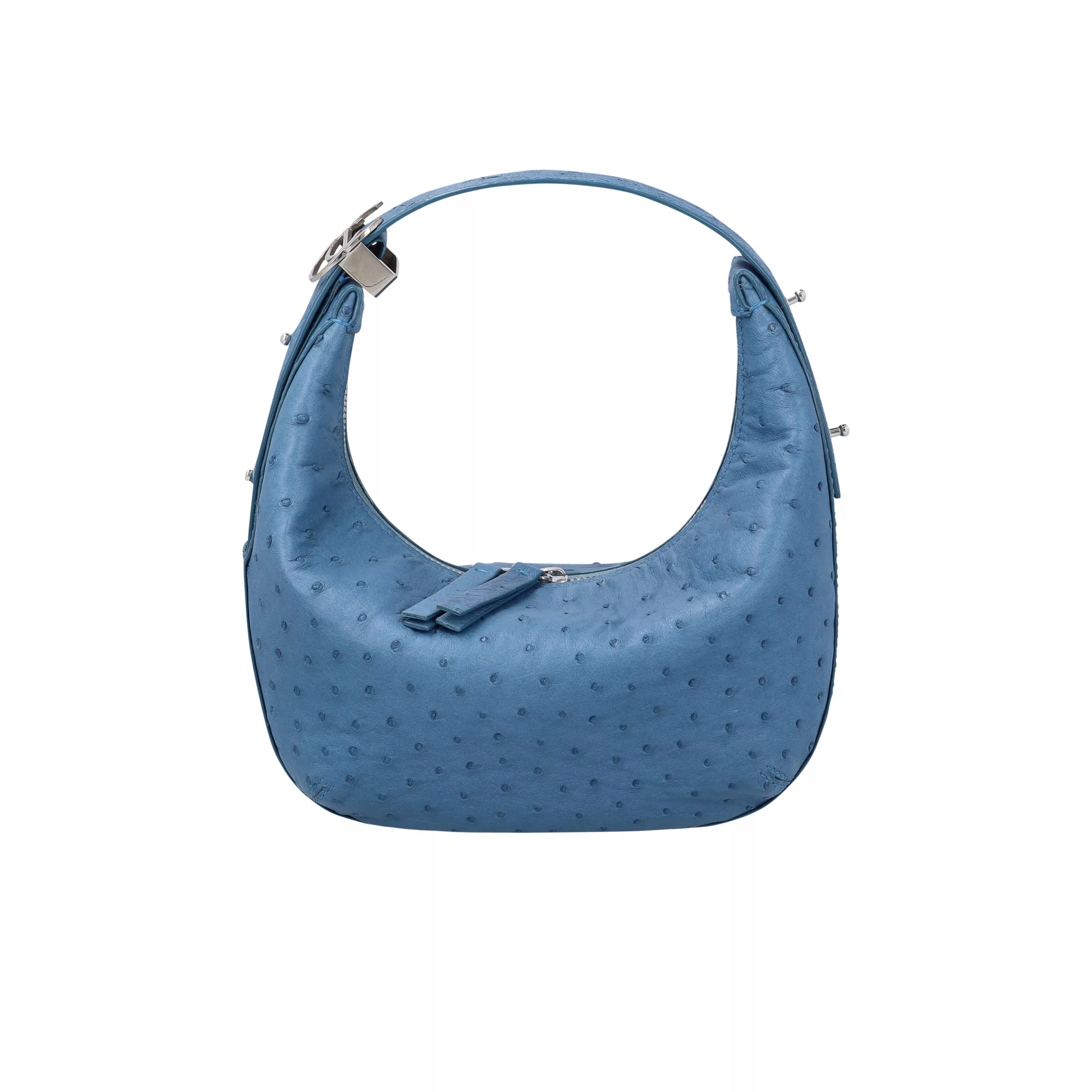Maroon ostrich-textured handbag with gold zipper on a white background
